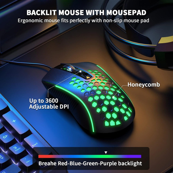 Souris gaming ergonomique rétroéclairée : Souris gaming rétroéclairée RVB à 4 niveaux de DPI disponibles : 1200/1600/2400/3200. Sa coque perforée en nid d’abeille garde vos paumes au frais même après une utilisation prolongée et vous offre une expérience tactile optimale.