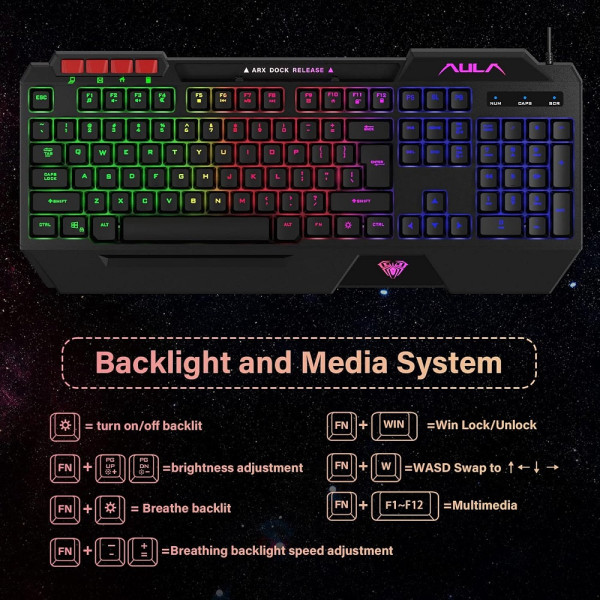 Clavier rétroéclairé arc-en-ciel 104 touches : Ce clavier gaming rétroéclairé RVB prend en charge 19 touches sans conflit, les touches WASD et WIN interchangeables pour le jeu, une touche pour allumer et éteindre la lumière, passer du mode respiration à l’arrêt, et 12 combinaisons de touches multimédia (FN + F1 à F12), idéal pour les joueurs sur PC.